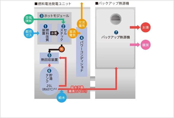 都市ガスから水素を取り出し、空気中の酸素と反応させて発電します。同時に発生する熱で、お湯づくりに再利用。家での発電により、光熱費削減、CO2排出量削減、地球温暖化防止にも貢献します。