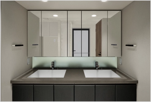 ※A・At・C・Ct・E・F・Hrタイプ:五面鏡・2ボウル・タオル掛け2本、B・Bt・D・D’タイプ:三面鏡・1ボウル・タオル掛け1本
